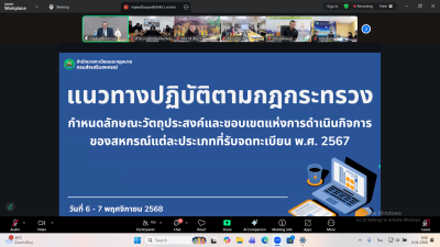 วันที่ 6 พฤศจิกายน 2568 นายอรรถชัย จันทร์เจริญ สหกรณ์จังหวัดระนอง พร้อมด้วยเจ้าหน้าที่ที่เกี่ยวข้อง เข้าร่วมประชุมชี้แจงแนวทางปฏิบัติตามกฎกระทรวงกำหนดลักษณะ วัตถุประสงค์ และขอบเขตแห่งการดำเนินกิจการของสหกรณ์แต่ละประเภทที่จะรับจดทะเบียน พ.ศ. 2567 ผ่านระบบ Zoom Meeting ณ สำนักงานสหกรณ์จังหวัดระนอง อำเภอเมืองระนอง จังหวัดระนอง โดยมีนายประวัติ แดงบรรจง รองอธิบดีกรมส่งเสริมสหกรณ์ เป็นประธานในพิธีฯ ซึ่งการประชุมครั้งนี้มีวัตถุประสงค์เพื่อซักซ้อมและชี้แจงแนวทางปฏิบัติให้แก่บุคลากรกรมส่งเสริมสหกรณ์ ให้เกิดความเข้าใจในการรับจดทะเบียนข้อบังคับให้เป็นไปในทิศทางเดียวกัน
